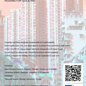 HOUSING FOR ISOLATING We have online discussion for The Next Urbanism and Architecture Under/After COVID-19. This series is subtitled “Is Modernism Frozen?” and the discussions were held with titles “HOW DO YOU MAP MODERNISM UNDER/AFTER COVID-19” and “TRAFFIC SEEKS ANOTHER WAY”. Now we are going to have the third public panel discussion titled “HOUSING FOR ISOLATING” and you are invited to participate. Panelists:Zara Ferreira (Instituto Superior Técnico, University of Lisbon)Johannes Widodo (National University of Singapore)Moderator:Takayuki Suzuki (Wuhan University, China) It is planned as a ZOOM meeting at 7pm in Japan, 10am in GMT, 90 minutes to two hours, on 12…