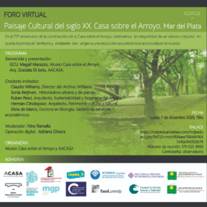 Organized by Museo Casa sobre el Arroyo and AACASA, the virtual forum “Cultural Landscape of the 20th century. House on the Stream, Mar del Plata, Argentina” occurs on the 75th anniversary of the construction of the House on the Stream, designed by Amancio Williams and Delfina Galvez Bunge, as a celebration of the integrality of a valuable set in which the imprint of territory and environment give rise to an architectural resolution recognized worldwide, being it a relevant example of the Modern Movement. Date: Monday, 7th December 2020, 7pm, Argentina, 10pm GMT. Link: https://mdpeduar.webex.com/mdpeduar/j.php?MTID=mcb1f0daee766dd41647e16a184392b78 Meeting number: 179 025 9659 Password: observatorio…