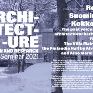 Docomomo International is pleased to share that the Architecture Departments of Lusófona University of Lisbon and Oporto are organizing their 2021 PhD seminar in Architecture: Design and Research having as title “Renja Suominen-Kokkonen – The Past Voices of the Architectural Heritage in Finland: The Villa Mairea and the Finlandia Hall by Alvar Aalto and Aino Marsio Aalto”. It will take place online via zoom Friday 23rd April at 14:30 (GMT). Synopsis: This lecture will discuss the problematic of architectural heritage including the questions of public memory and national heritage. The architectural case studies involve the Villa Mairea, a private villa…