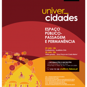 The Center for Urban Information of Lisbon (CIUL), together with partner universities such as FA-UL, ISCTE-IUL, FCSH-UNL, FBA-UL, IST-UL, has organized a 2-day event “Encontro UniverCidades”, to be held on 29th and 30th January. This event aims to reflect on the city of Lisbon in order to foster synergies between different educational institutions and the Municipality itself, around a common theme. This year the theme chosen was: Public Space – Passage and Stay [Espaço Público – Passagem e Permanência]. To know more and to check the full program, please visit: website