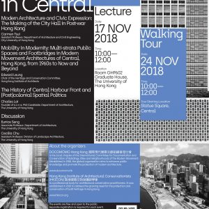 docomomo Hong Kong and Hong Kong Institute of Architecual Conservationsists (HKICON) would like to invite to a lecture “Modern Architecture in Central”. The lecute will take place 17th November 2018, at 10:00 am, in room GHP602 of the Graduate House, Hong Kong University (University Dr, Lung Fu Shan, Hong Kong). Organisers would also like to invite to a tour walk, taking place on 24th November. Starting point is Statue Square, Central, at 10:00 am. You can find the detailed programme and more information here.