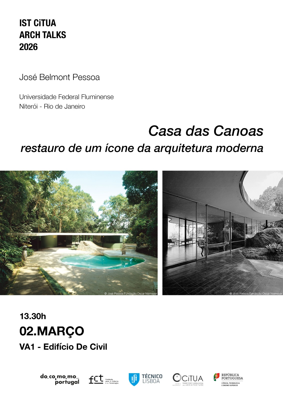 Docomomo Portugal is happy to announce that the first talk of the IST-CiTUA ARCH TALKS 2026 organized by CiTUA together with Docomomo Portugal is taking place on 2 March 2026 at 13H30 at auditorium VA1 at Instituto Superior Técnico. Titled “Casa das Canoas: restauro de um ícone da arquitetura moderna” this first lecture will be held by professor José Belmont Pessôa from the UFF – Universidade Federal Fluminense (Brasil).