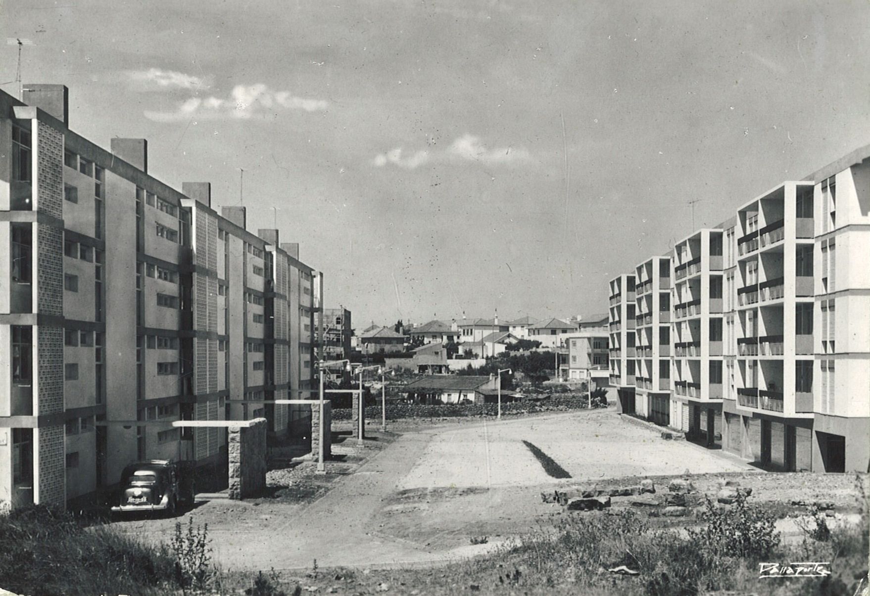 The neighborhood is composed of seven blocks, parallel to each other and perpendicular to the main road, arranged along a north–south axis, with notable spacing and rhythm that enhance the quality of the ground plan. The layout of the buildings allows for the creation of a generous central garden space, and the distance between blocks highlights the importance given to the street as a lived public space. Ruy d’ Athouguia introduces an urban model closer to the German Siedlungen, where, through a design that seeks to root the buildings—stone entrance walls and the stone plinths on which the blocks rest—he demonstrates a stronger connection to the site, intentionally evoking the memory of the former stone quarry that once existed there.
