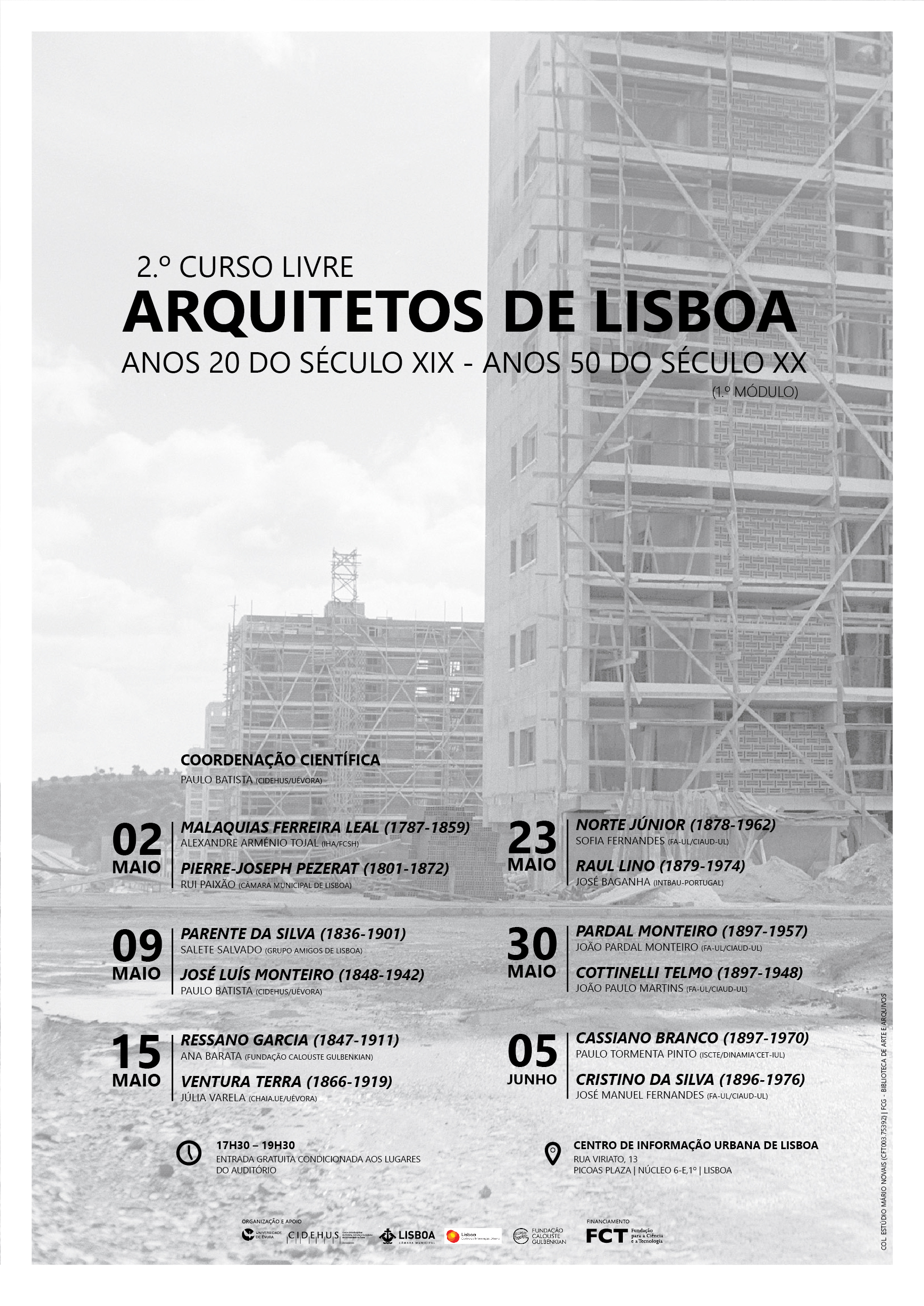 The 2nd course Arquitetos de Lisboa: Anos 20 do século XIX – Anos 50 do século XX (Lisbon Architects: the 20´s of the 19th century – the 50´s of the 20th century) is composed of seminars and will take place from May 3rd to June 5th, 2019, between 17:30 and 19:30, at the Centro de Informação Urbana de Lisboa.