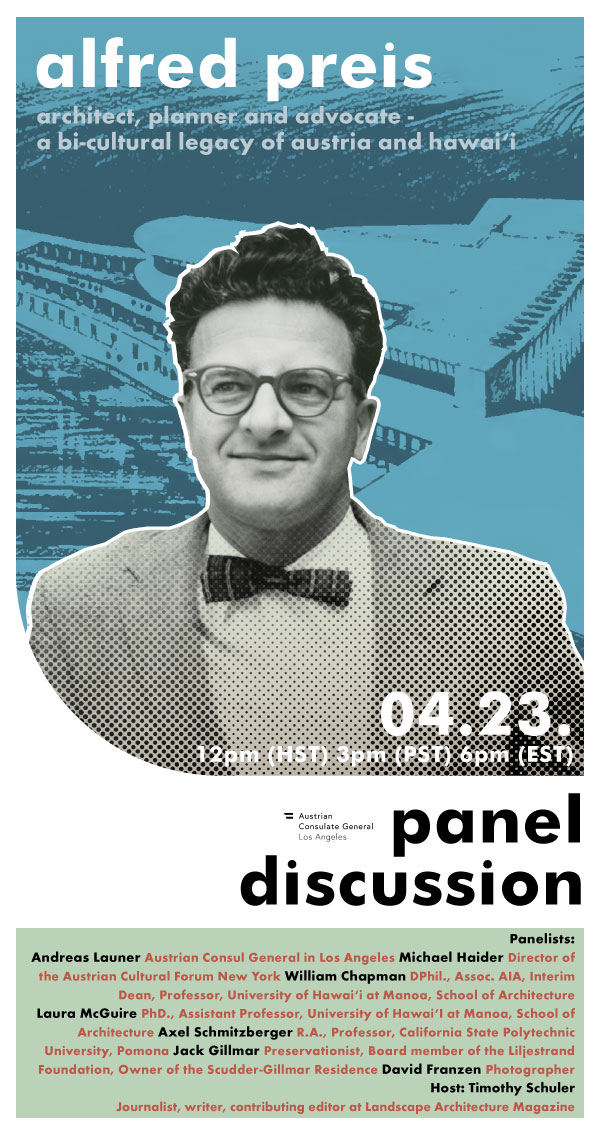 To celebrate the prolific and varied work and life of the Austrian-Hawaiian modern Architect Alfred Preis on the occasion of his 110th birth year we invite to visit a specially curated online exhibition and participate in the accompanying panel discussion online via zoom, happening next Friday, 23rd April at 12pm (HST) entitled “Alfred Preis – Architect, Planner and Advocate. A Bi-cultural Legacy of Austria and Hawaiʻi”