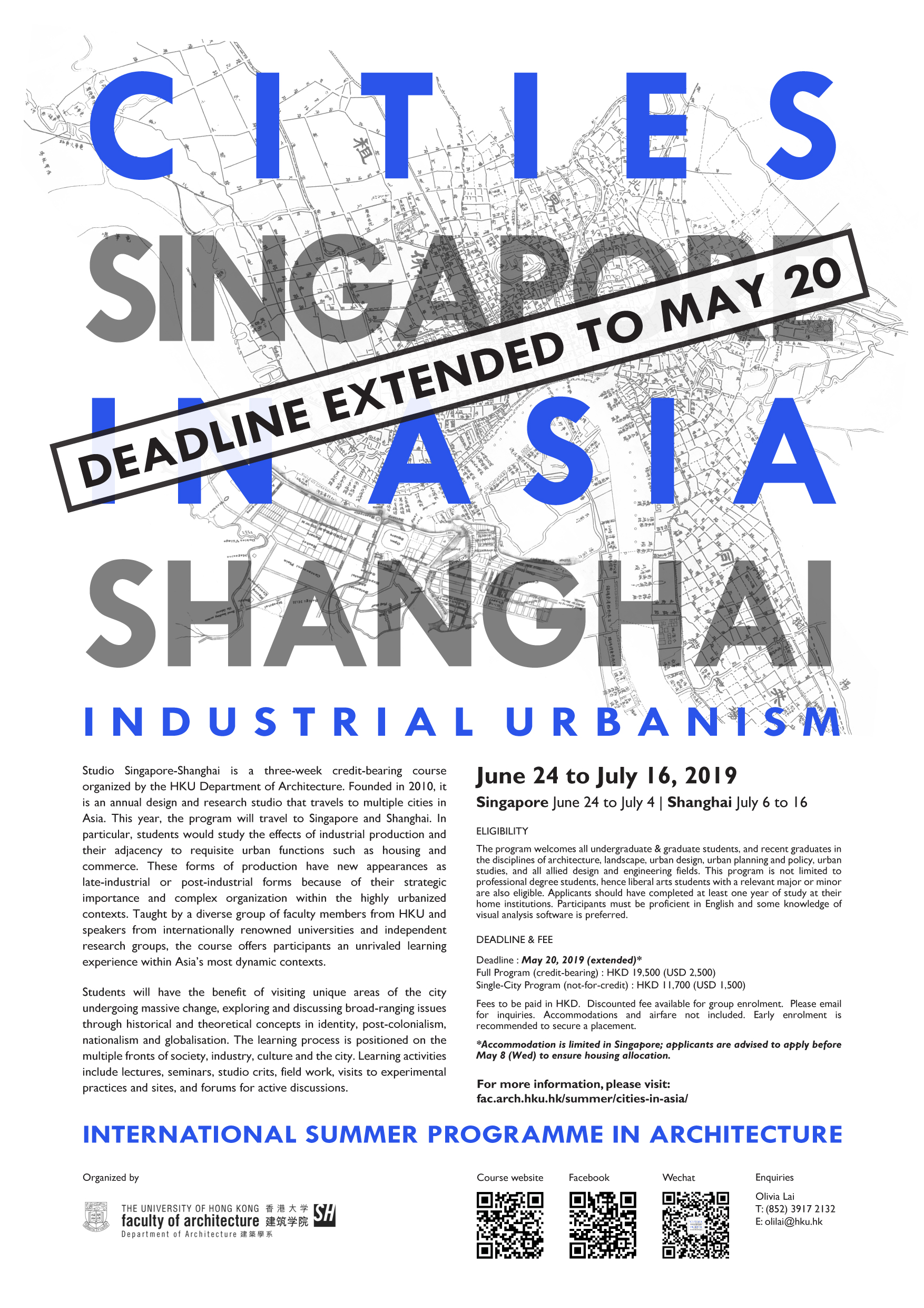 “The International Summer Programme in Architecture: Cities in Asia (Studio Singapore-Shanghai) is a three-week credit-bearing course organised by the HKU Department of Architecture. Founded in 2010, it is an annual design and research studio that travels to multiple cities in Asia. Taught by a diverse group of faculty members from HKU and speakers from internationally renowned universities and independent research groups, the course offers participants an unrivaled learning experience within Asia’s most dynamic contexts.