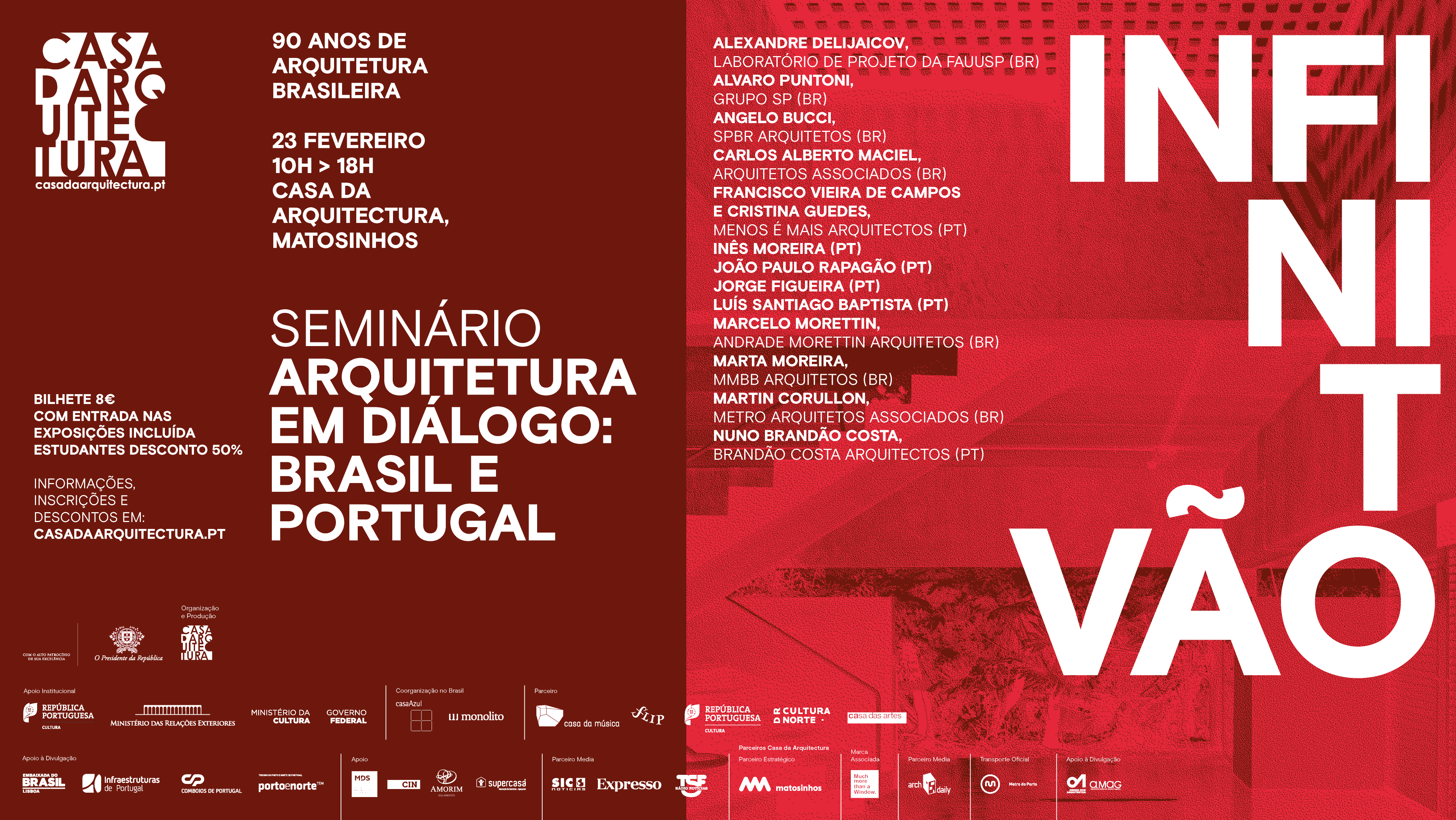 Starting from the themes proposed in the Exhibition “Infinito Vão – 90 years of Brazilian Architecture” [Infinito Vão – 90 Anos de Arquitetura Brasileira], the seminar “Architecture in Dialogue: Portugal and Brazil” [Arquitetura em Diálogo: Portugal e Brasil] invited 14 architects from the two countries to talk about the distinctive traits of both the new architectonical productions.