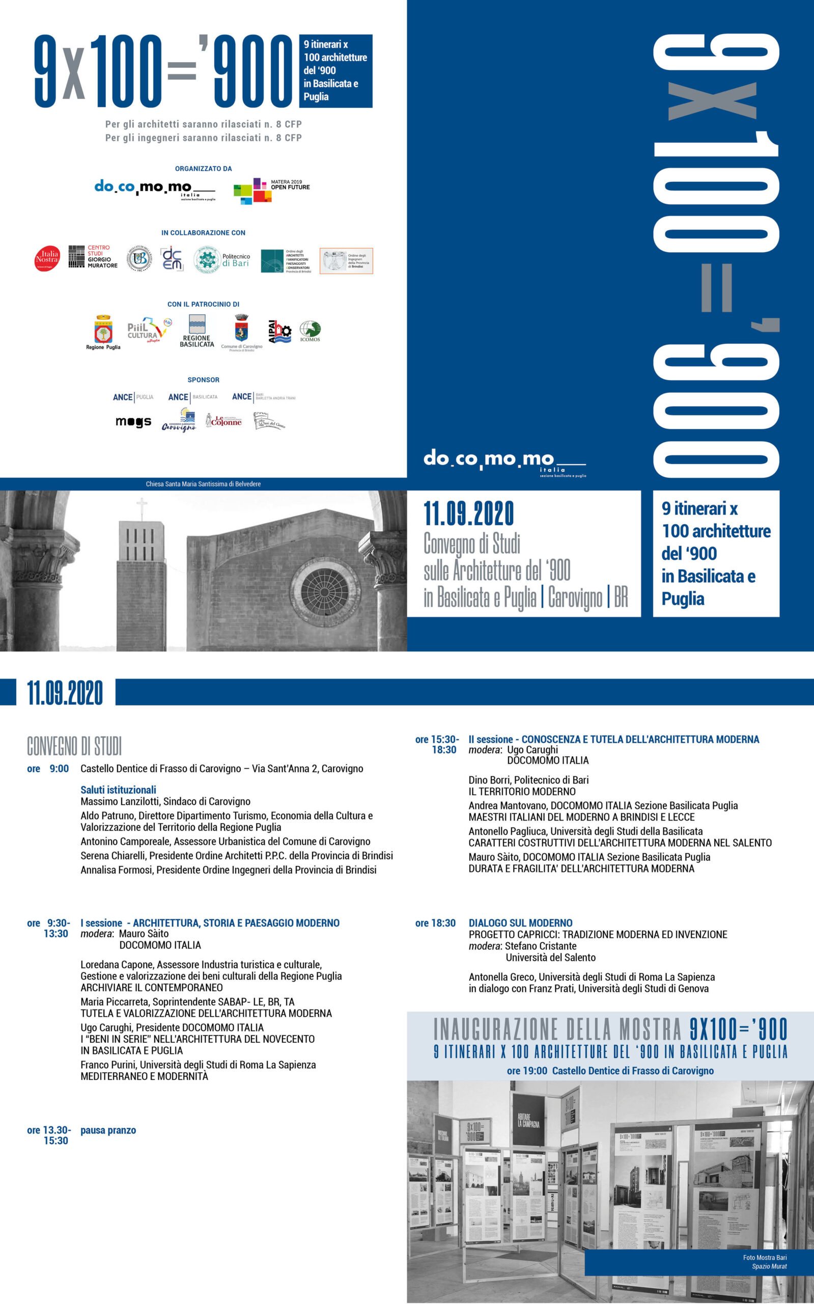 “9 x 100 = 900, 9 itinerari per 100 architetture del ‘900 in Basilicata e Puglia” is the title of the conference and exhibition dedicated to the modern movement architecture, organized by Docomomo Italy, 11th September 2020, in Carovigno.