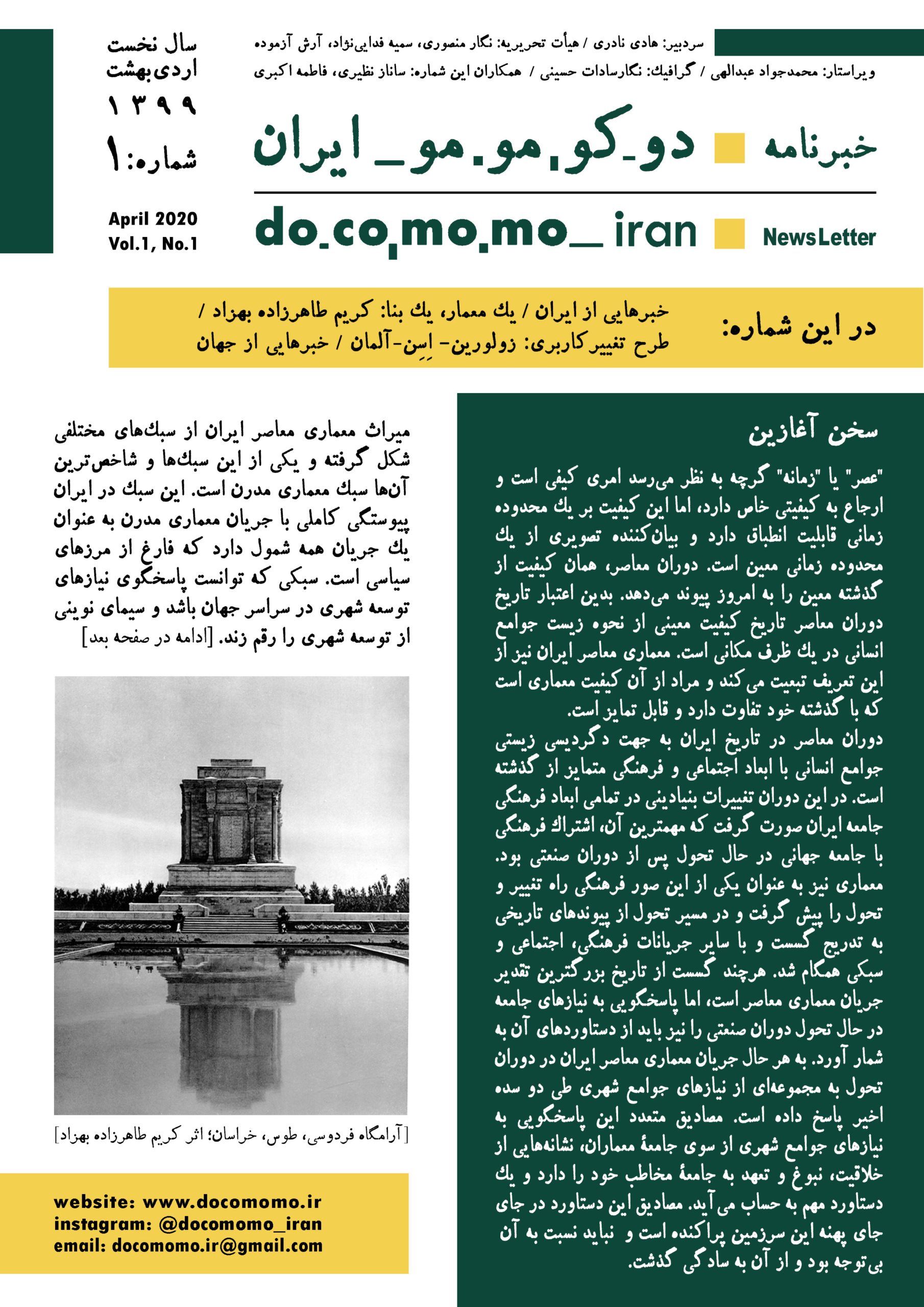 Docomomo International is glad to announce that Docomomo Iran published the first issue of its newsletter. Docomomo Iran Newsletter is in pdf format and will be published every month (based on Iranian solar calendar). The language of the newsletter is Persian and it consists of five sections: The Foreword, One Architect; One Building, An Adaptive Reuse Project, and News from the World.