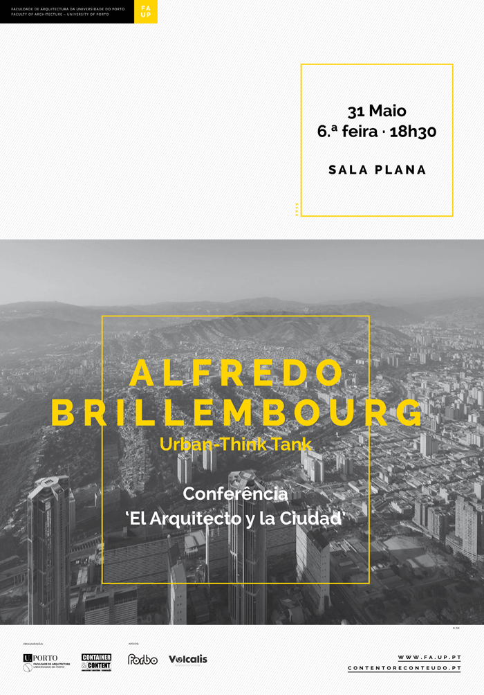 The architect Alfredo Brillembourg will present the lecture “El Arquitecto y la Ciudad” [The Architect and the City] at 31st May 2019 at Faculty of Architecture of Porto University. He founded, with Jubert Klumpner, the Urban-Think Tank Studio (U-TT).