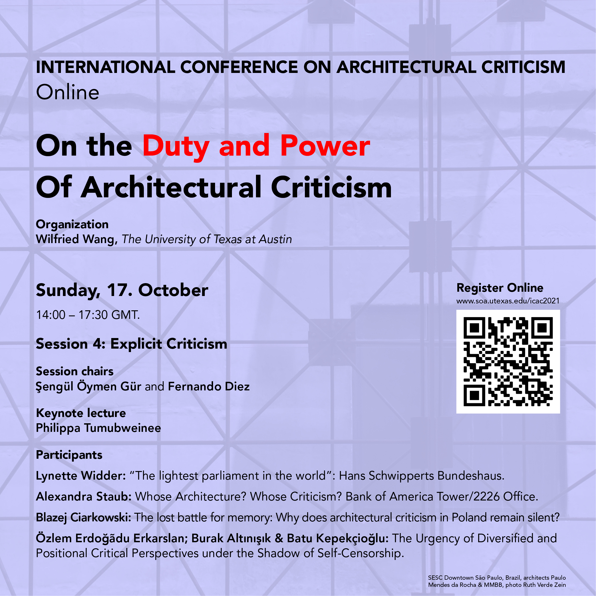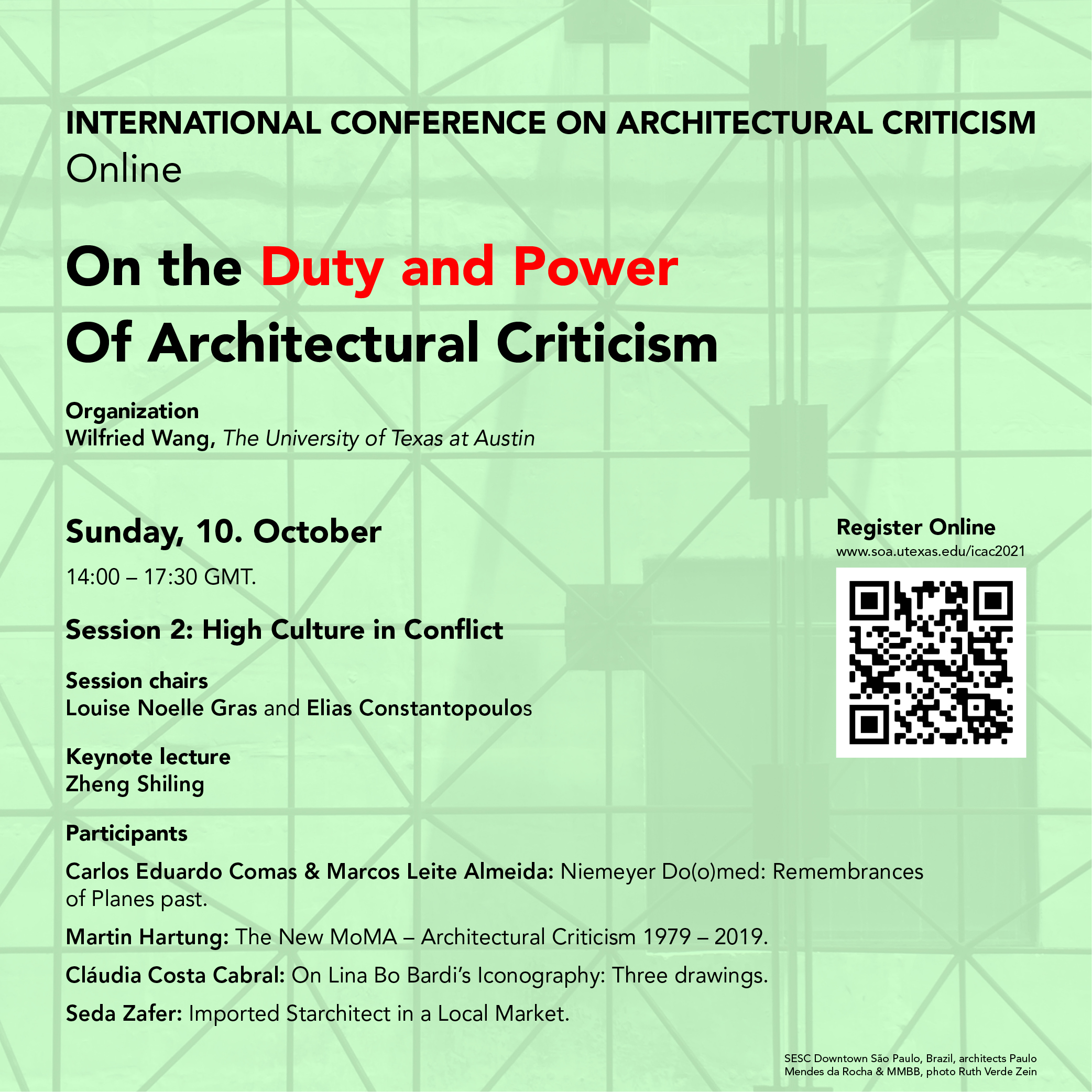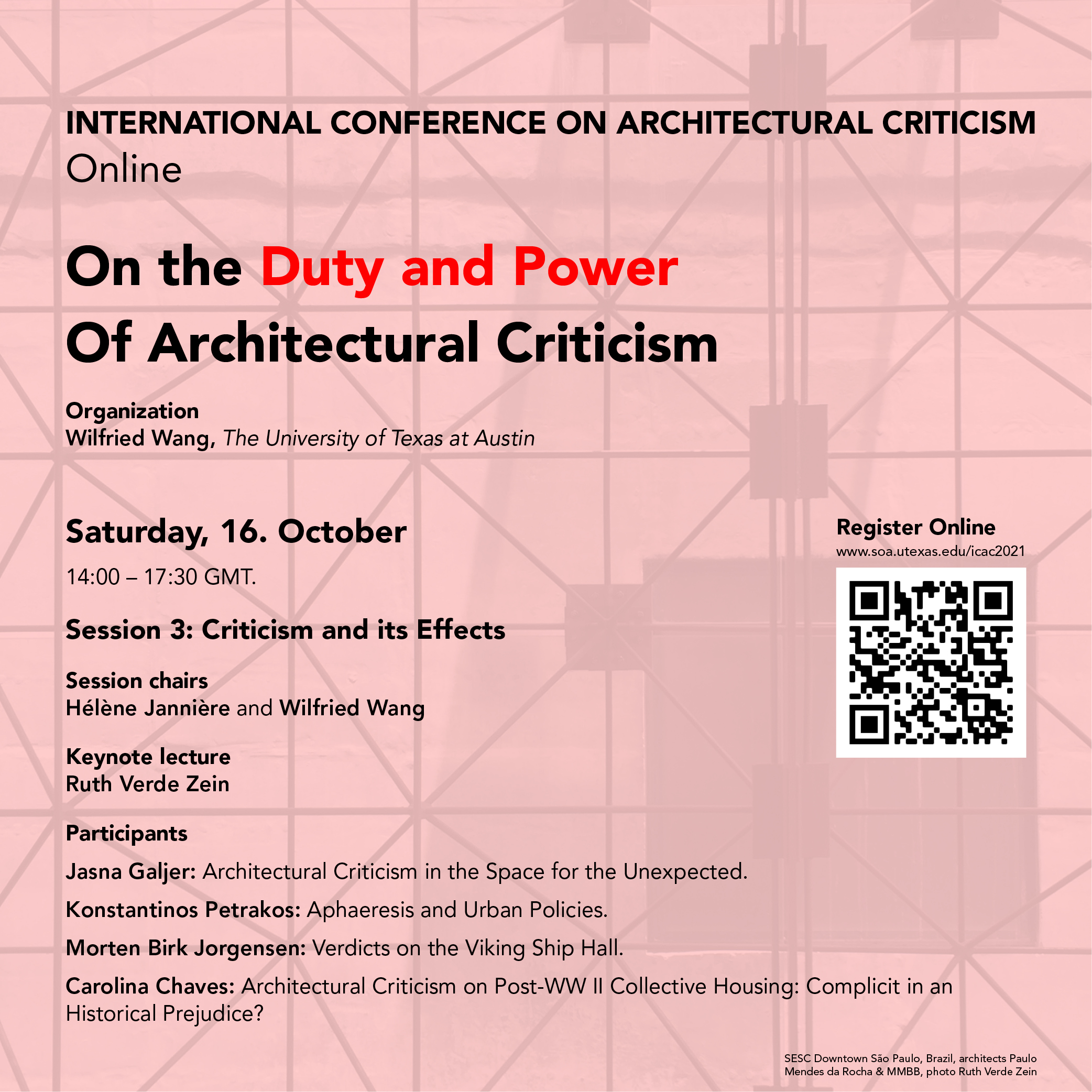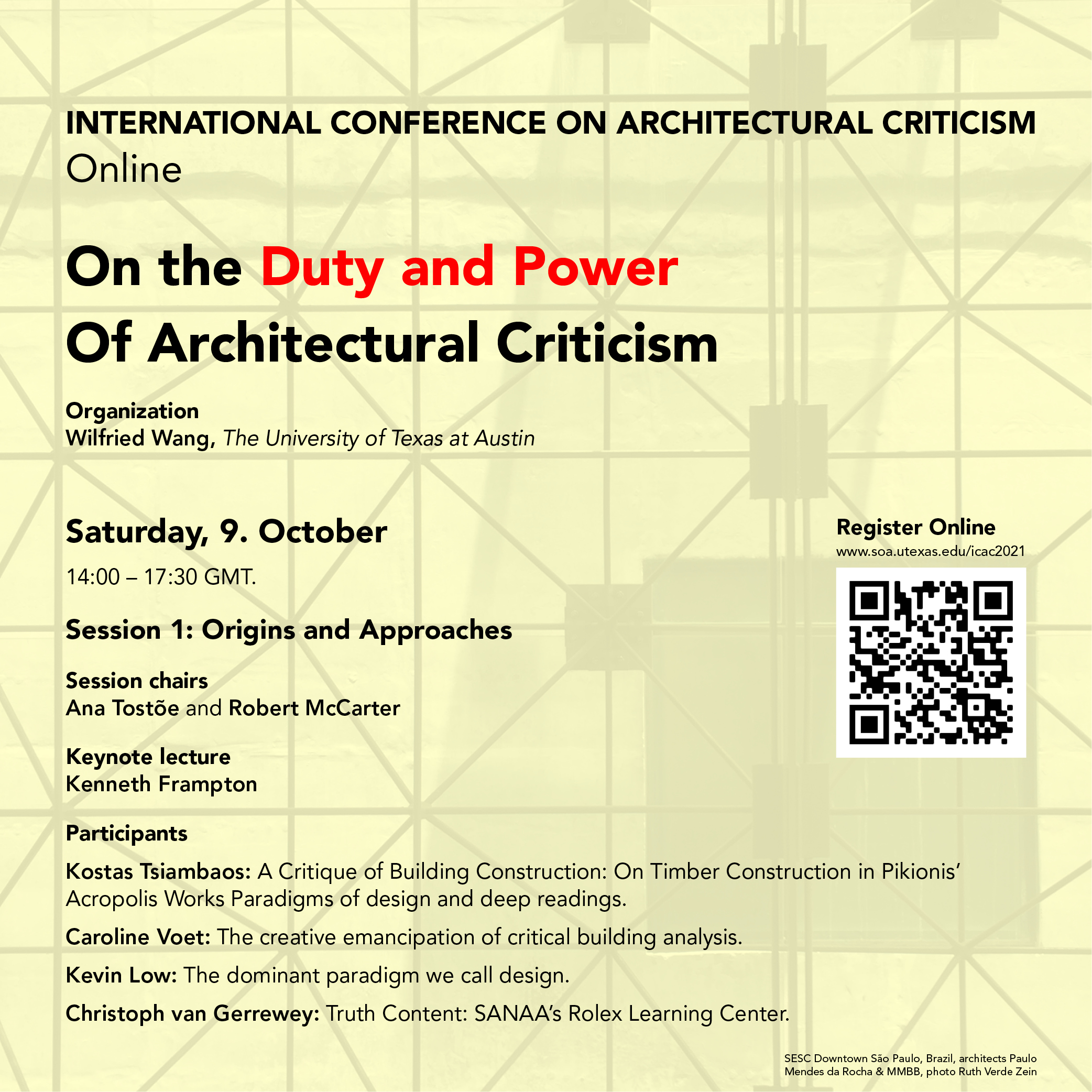 It is with great pleasure that Docomomo International shares the program of the International Conference on Architectural Criticism: on the Duty and Power of Architectural Criticism, organized by the International Committee of Architectural Critics (CICA) and hosted by the School of Architecture, The University of Texas at Austin, taking place on 9-10 and 16-17 October 2021, online via Zoom at 14:00 – 17:30 GMT.