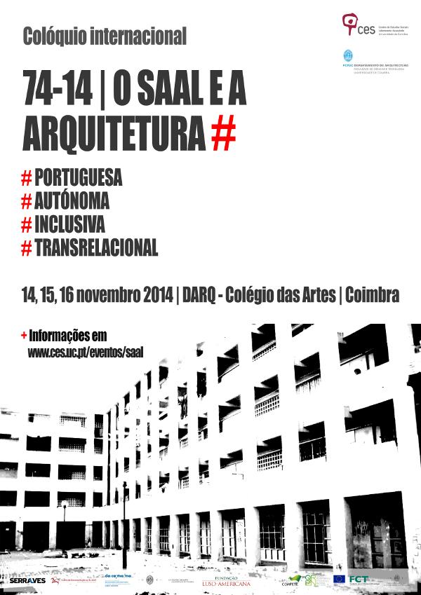 The Centre for Social Studies and the Department of Architecture of Coimbra University (Portugal) will organize the INTERNATIONAL COLLOQUIUM 74 14 SAAL # ARCHITECTURE on November 14-16, 2014, in partnership with the Serralves Foundation, Documentation Centre April 25th and Docomomo International.