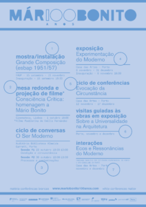 After the launching of MárioBonito.1OOanos with the exhibition “Grande Composição (ESBAP, 1951-57)” [Big Composition], at the Faculty of Architecture of the University of Porto, FAUP, and the round table with the film “Consciência Crítica: homenagem a Mário Bonito” [Critical Conscience: homage to Mário Bonito], at Cinemateca Portuguesa, on 23rd and 30th October will take place at the Auditorium of the Almeida Garrett Municipal Library the cycle of multidisciplinary conversations “o ser moderno” [the modern being] – having as invited guests José Miguel Rodrigues, António Preto, Gonçalo Amorim and Alexandre Alves Costa (23rd October), and Domenico Chizzoniti, Alexandra Balona, Cristina Pallini and Ana Tostões (30th October).