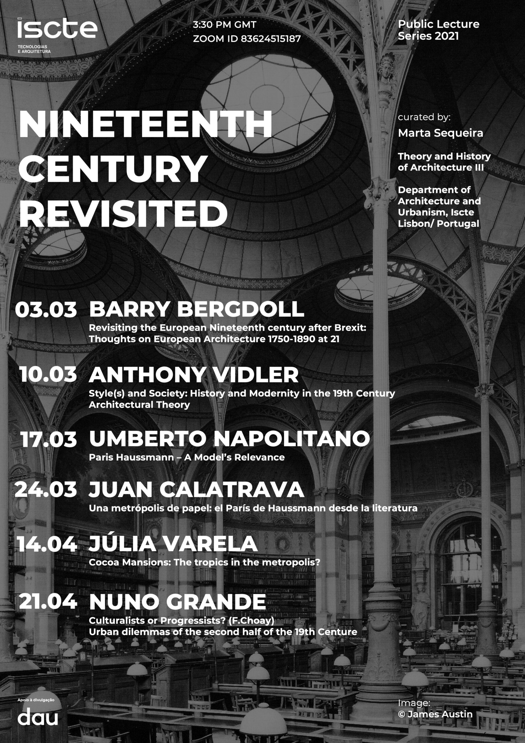 A cycle of lectures on 19th century architecture of the Department of Architecture and Urbanism, ISCTE Lisbon / Portugal, entitled “Nineteenth Century Revisited” will happen every Thursday between the 3rd March and the 21st April 2021, online via ZOOM at 3.30 pm (GMT+0).