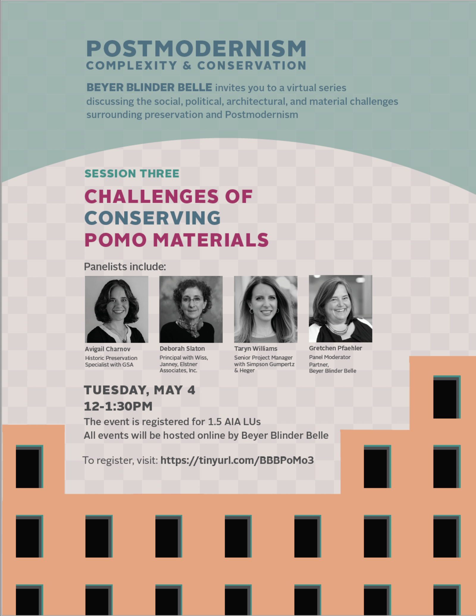 Docomomo International would like to share virtual series entitled “Postmodernism Complexity & Conservation” organized by Docomomo US. The series discuss the social, political, architectural, and material challenges surrounding preservation and Postmodernism. The third installment in the series will be a panel discussion covering the challenges of conserving Postmodern materials and will be hosted by Beyer Blinder Belle.