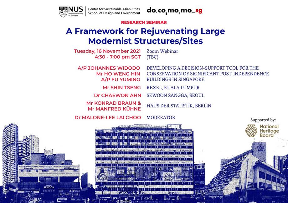Docomomo International is trilled to share that the Centre for Sustainable Asian Cities (CSAC) of the School of Design and Environment, NUS, and the Docomomo Singapore are co-organizing a half-day research seminar on “A Framework for Rejuvenating Large Modernist Structures/Sites”, on 16th November 2021.